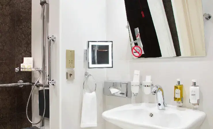 أوسع الممرات و إطارات الأبواب, الارتفاع الأمثل من أسرة مقابض الأثاث, حوض استحمام و مرحاض مرافق فسيحة دش ومرحاض غرفة مزودة القضبان اليد بالإضافة إلى المساعدة الشاملة من قبل موظفي الفندق – كل هذا متاح لإقامة مريحة من للنزلاء المعاقين جسديا.