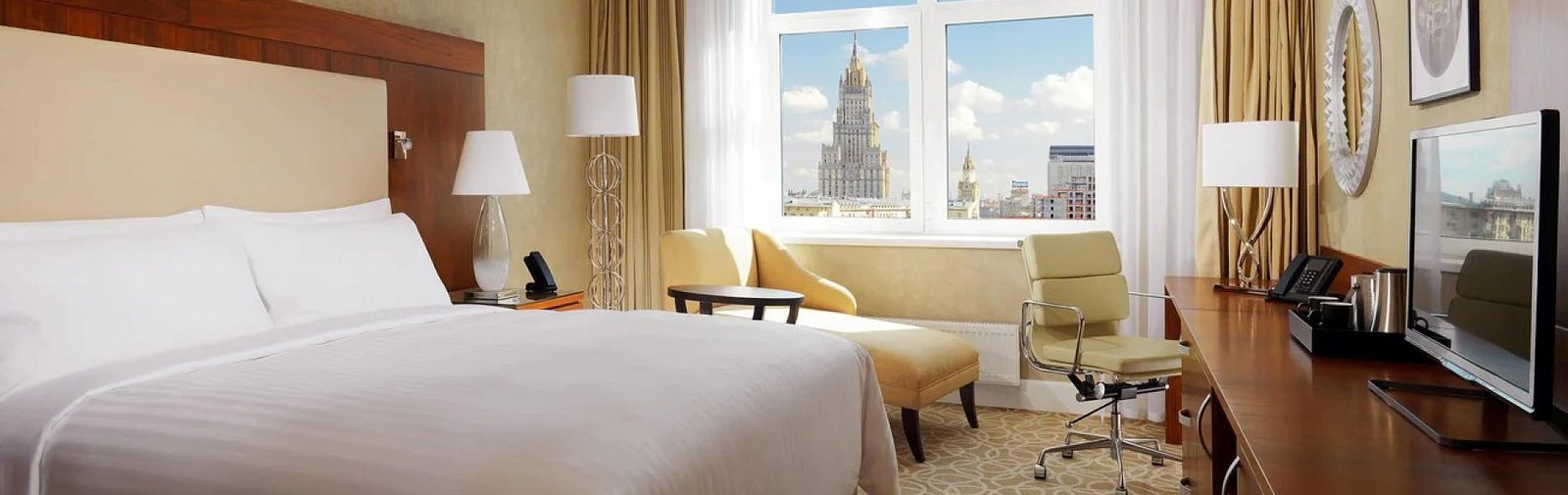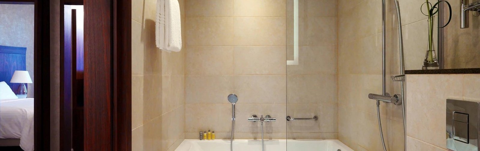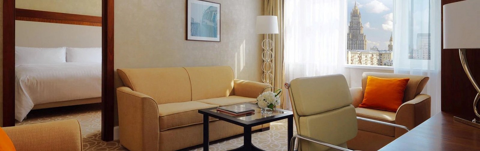 اثنين من غرفة الفندق مع غرفة نوم منفصلة وغرفة معيشة مع سرير أريكة وحمام إضافي.