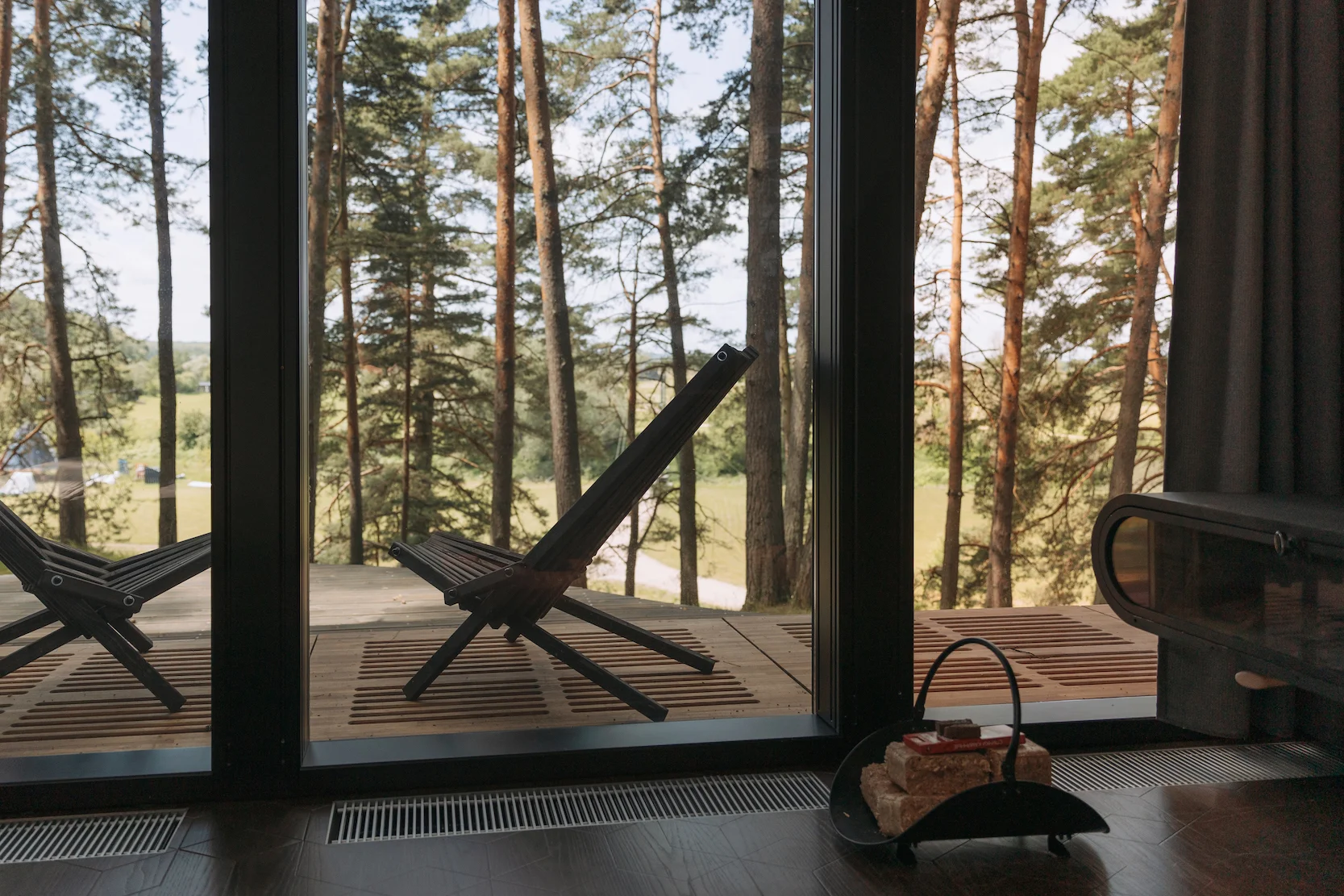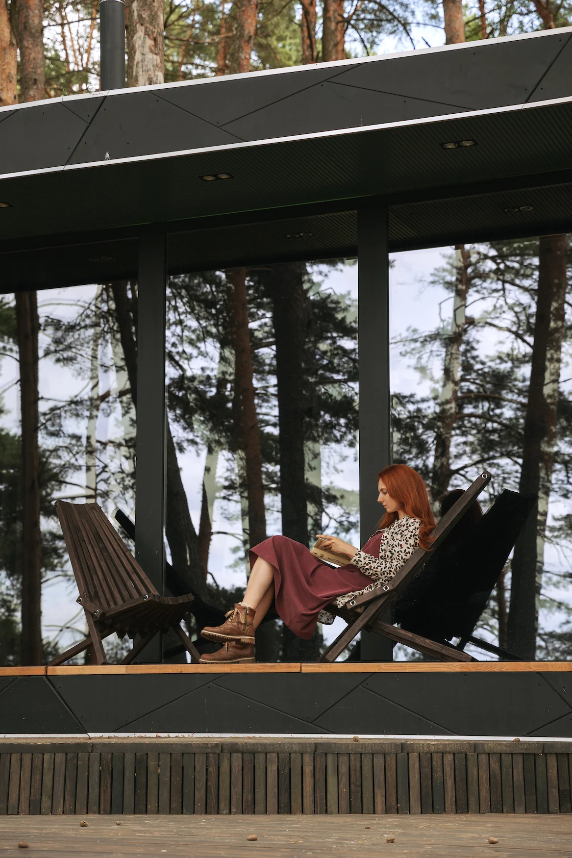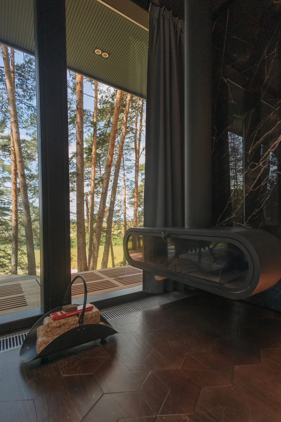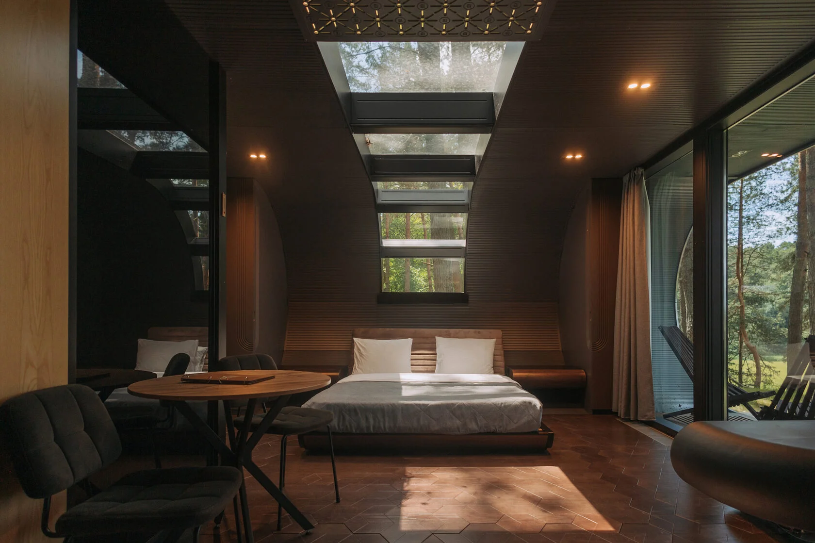 The spacious room of 32 sq m with a futuristic design is equipped with everything necessary for a comfortable stay. The room is designed as a studio and combines a sleeping area and a kitchen area in one space. The kitchen has a full-fledged refrigerator with a freezer, a two-burner hob, a microwave oven, a coffee machine and a tea station, as well as the necessary set of dishes. This accommodation option is distinguished by cozy stylish details and unusual solutions: an amazingly shaped fireplace, a huge panoramic window instead of a wall, a transparent part of the roof above the bed.