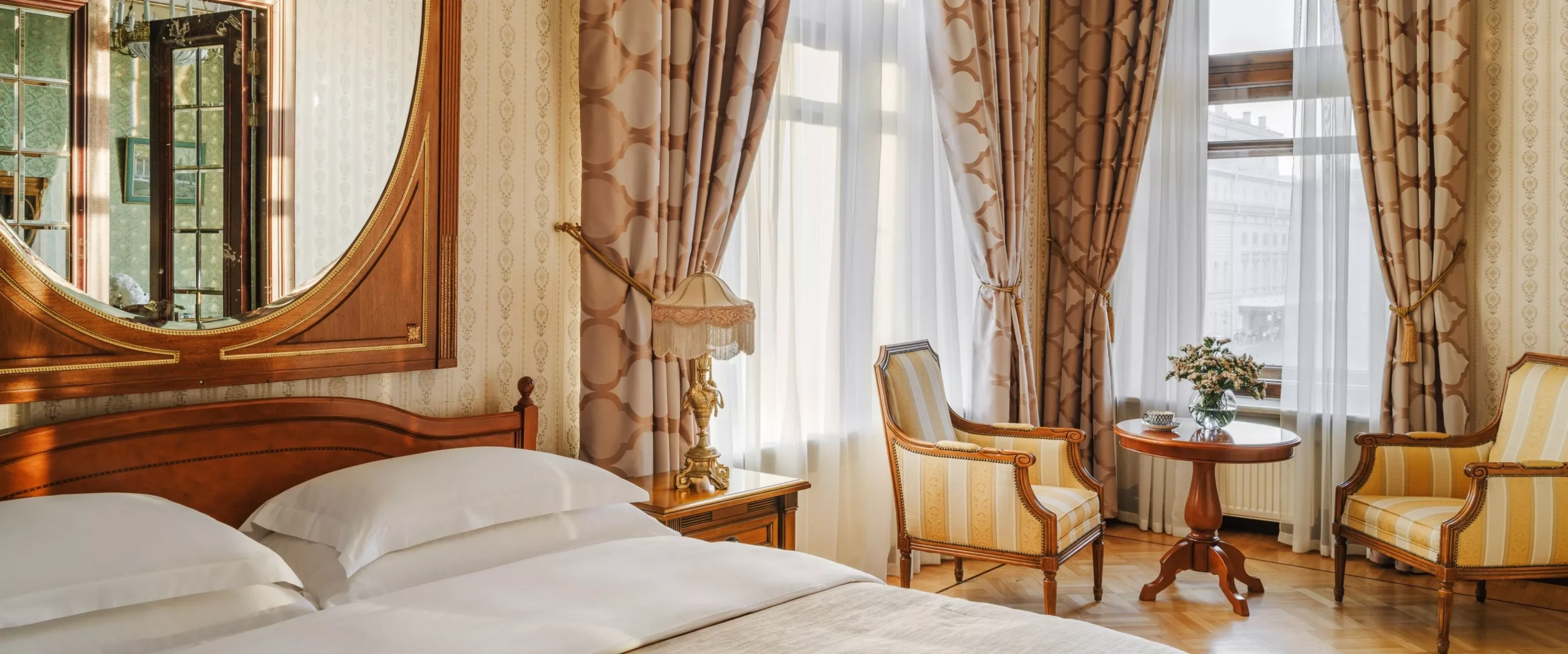 Bolshoi Suite is the embodiment of refined luxury and comfort. The spacious living room with a soft relaxation area and panoramic windows opens to Theater Square, creating an atmosphere of secluded aristocracy. Antique details of the interior, unique decorative panels, exquisite lighting – all this transports guests to the era of glittering receptions and elite evenings. In the bedroom there is a comfortable King Size bed with a premium mattress, and in the elegant bathroom there is a classic bathtub for full relaxation. The interiors of the historical rooms and suites at the Metropol Hotel are designed in a unique Art Nouveau style, so each has its own distinctive décor and may differ from those shown on the website.