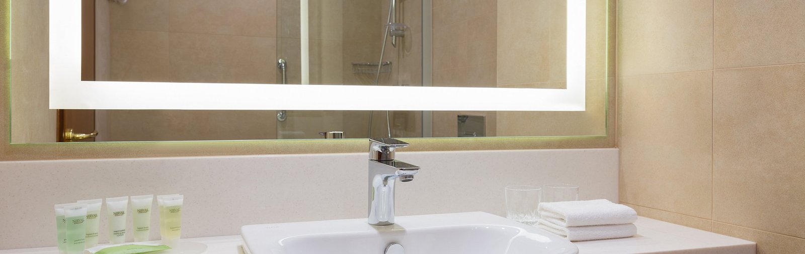 Bathroom equipment: Shower cabin, Hair dryer, Towels, Cosmetics
