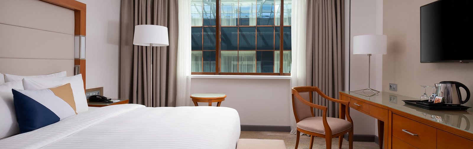 Comfortable room with one large bed and a view of the hotel’s Atrium or the street