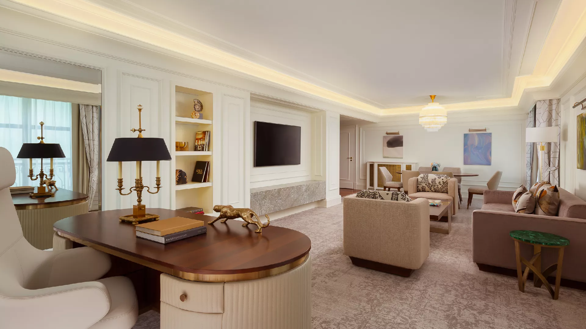 Architectural cornicing enhances the room’s character, and an oval marquetry table beneath a crystal chandelier offers an inviting setting for conversation or quiet reflection. On the other side of the room, a writing desk crafted from rich wood, brushed brass, and leather brings both elegance and functionality. The bedroom, furnished with custom-designed pieces, opens onto a spacious walk-in wardrobe. In the marble-clad bathroom, expansive mirrors and ambient lighting create a sense of calm and well-being.