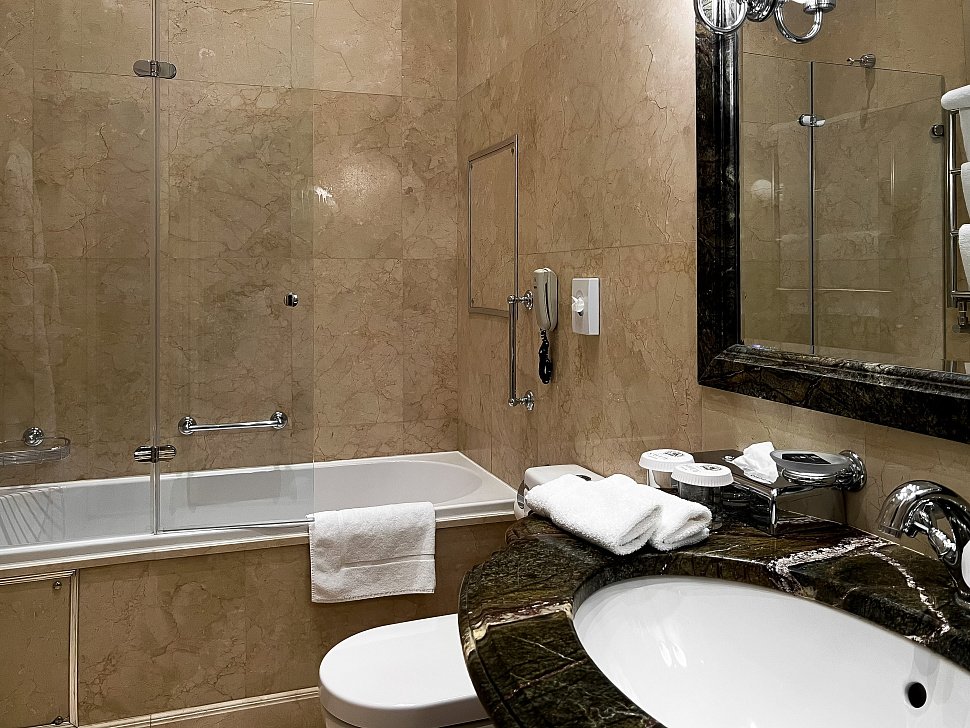 A marble bathroom is equipped with a heated marble floor and towel rack, hairdryer, magnifying mirror. In each room of our luxurious Moscow hotel accommodation there are white cotton fluffy bathrobes & slippers with Savoy Hotel monogram.