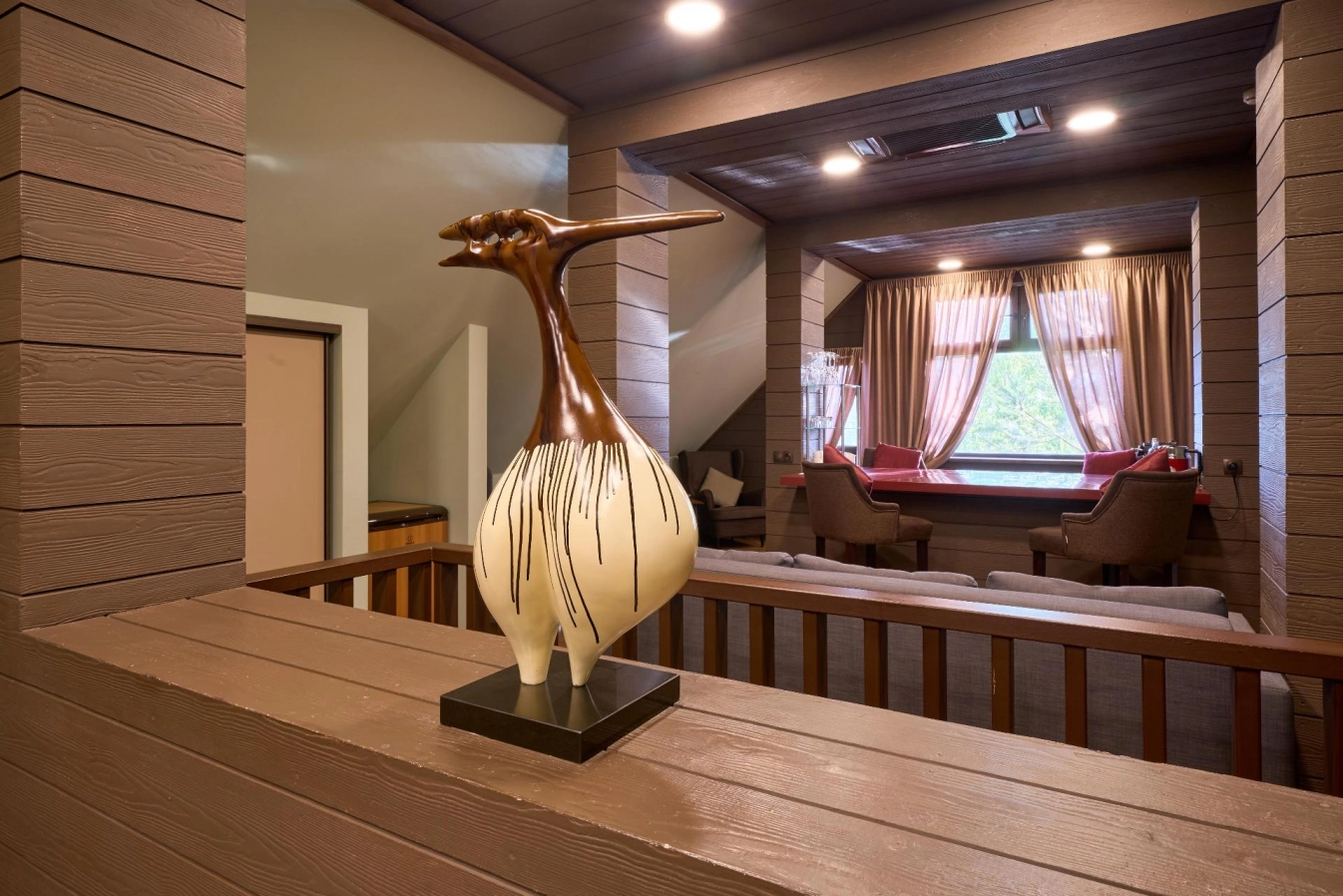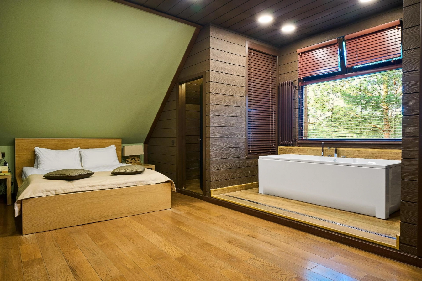 The penthouse is a unique offer of our hotel for two people. But this room can also accommodate a family or a company of up to 4 guests, 2 guests in the main seats and 2 in additional ones. The cost of an additional seat is 3000 rubles per day. At your disposal is a spacious studio room with two sofa areas, a bedroom, a dining area and a modern, comfortable bathroom with a picturesque view of the birch grove.