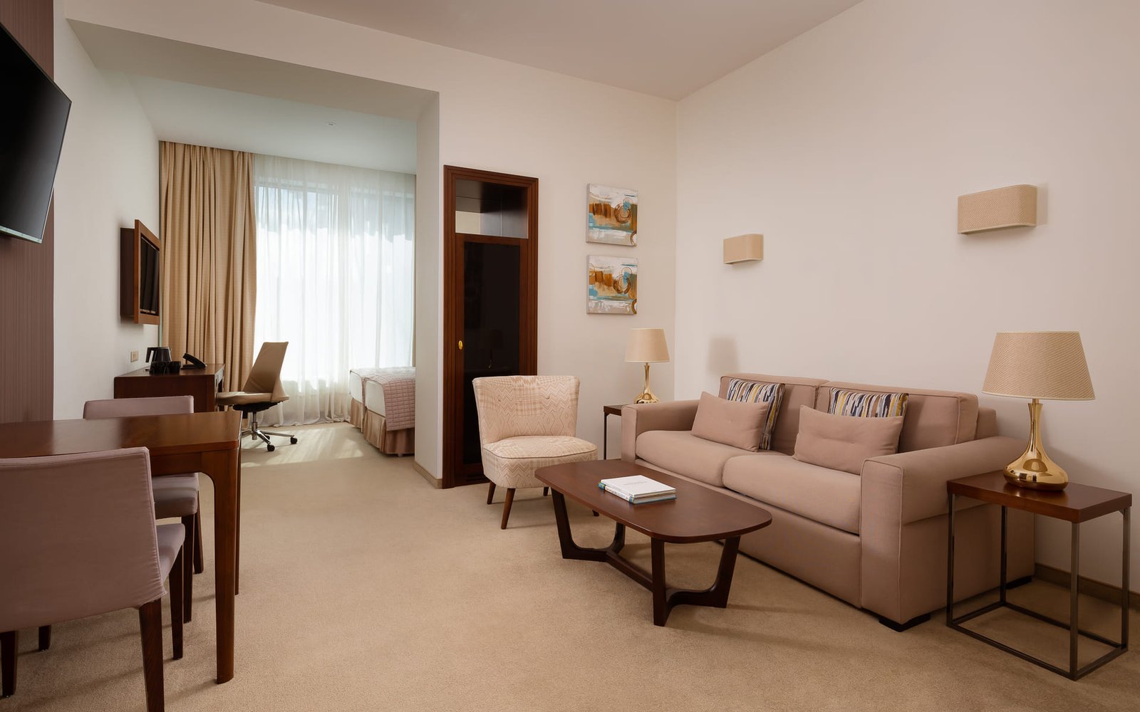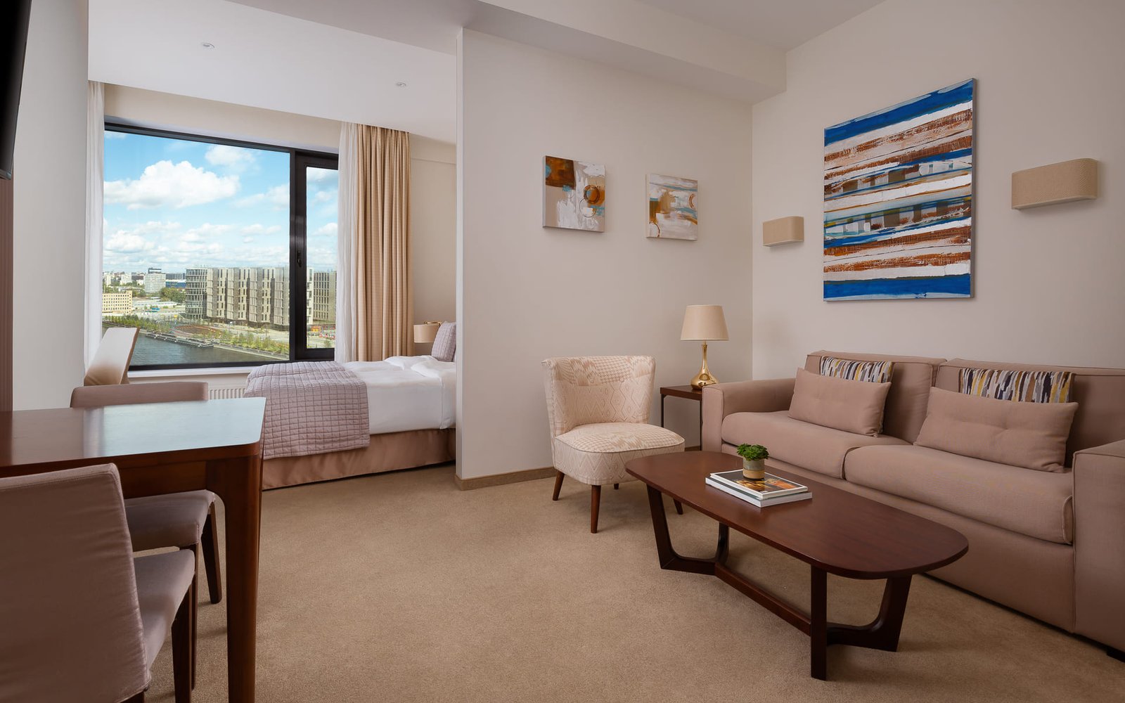 A room of increased comfort and functionality with an area of up to 41 sq.m. The space is divided into a bedroom and a living room with a folding sofa, which makes it possible to accommodate a third guest in an additional place. Rooms of this category offer views of the Moskva River or the courtyard.