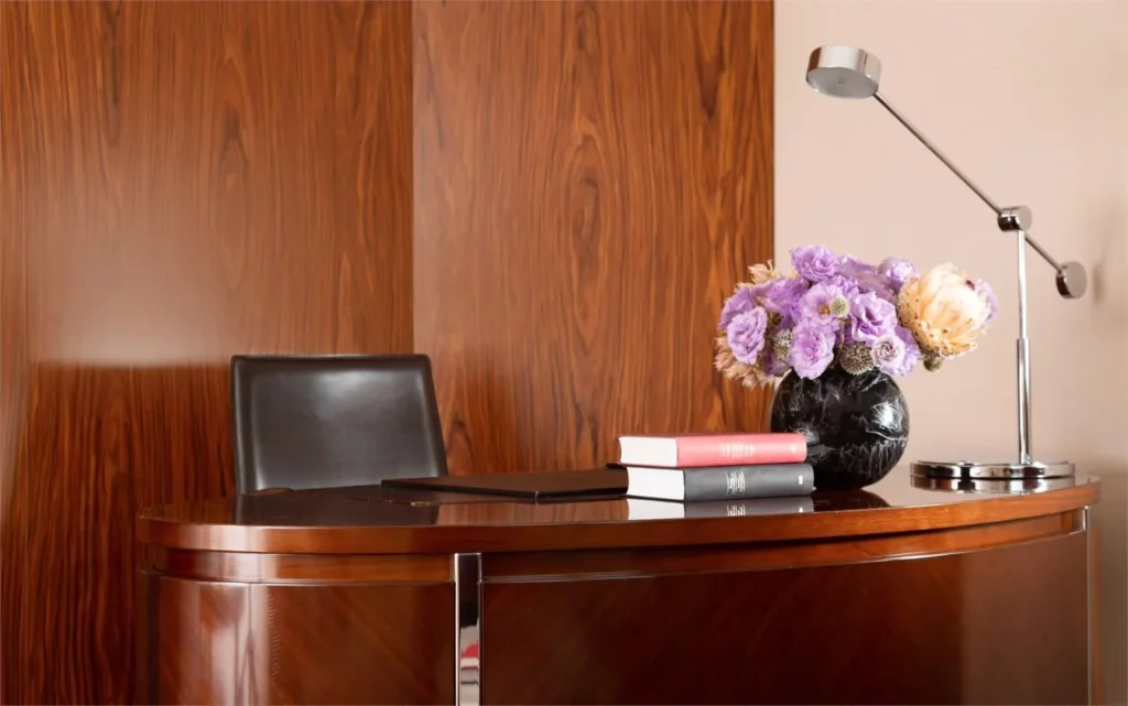 Exclusive, custom-made furniture and lighting create an atmosphere of understated luxury and elegance. The exquisite interior finishes utilize the highest-quality natural materials: rare woods, Italian marble, honey onyx, and crystals. The stunning glass spiral staircase in the hotel lobby, paired with a 12-meter hand-blown Murano glass chandelier, offers a perfectly balanced blend of modern and classic style.