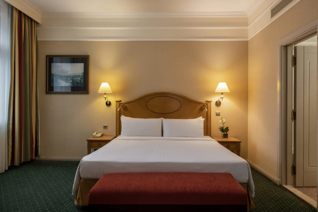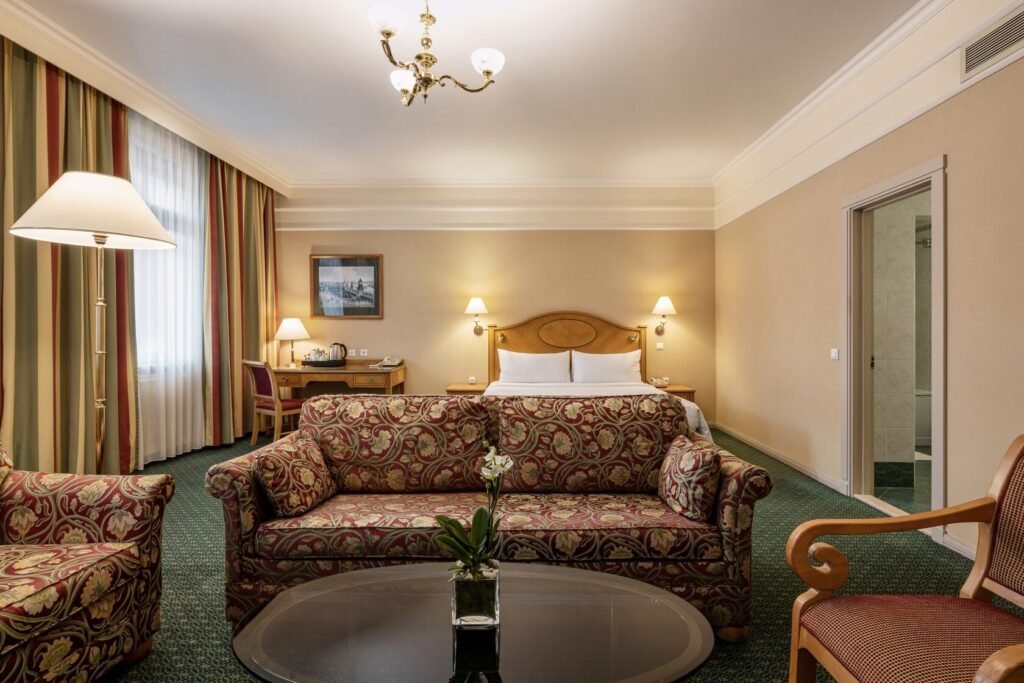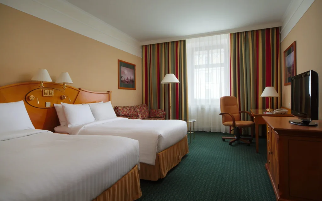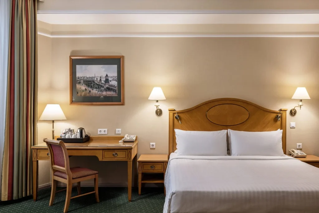 The hotel has 385 rooms, including suites, and three executive floors. The hotel has its own sports and wellness center with a swimming pool. Two restaurants and a lobby bar offer international and Russian cuisine. The hotel has 10 conference halls with a total area of over 850 sq. m.